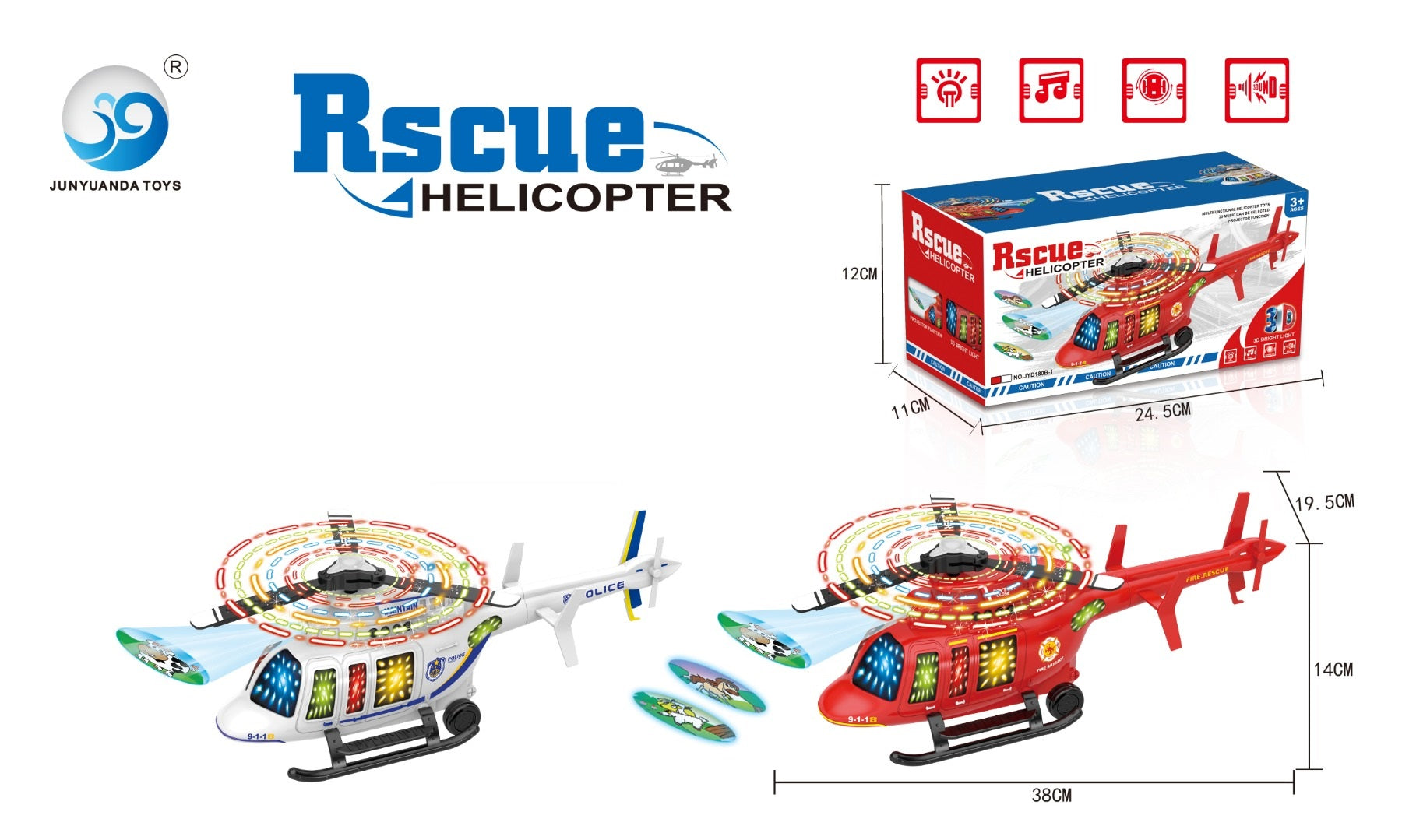 This battery-operated bump-and-go helicopter is packed with exciting features, including vibrant lights, engaging music, and a projector that adds an extra layer of fun. When it bumps into an obstacle, it changes direction and continues its flight! Available in two color mixes, it provides dynamic and interactive play. It comes in a sturdy packaging box, making it an ideal gift or easy to store.