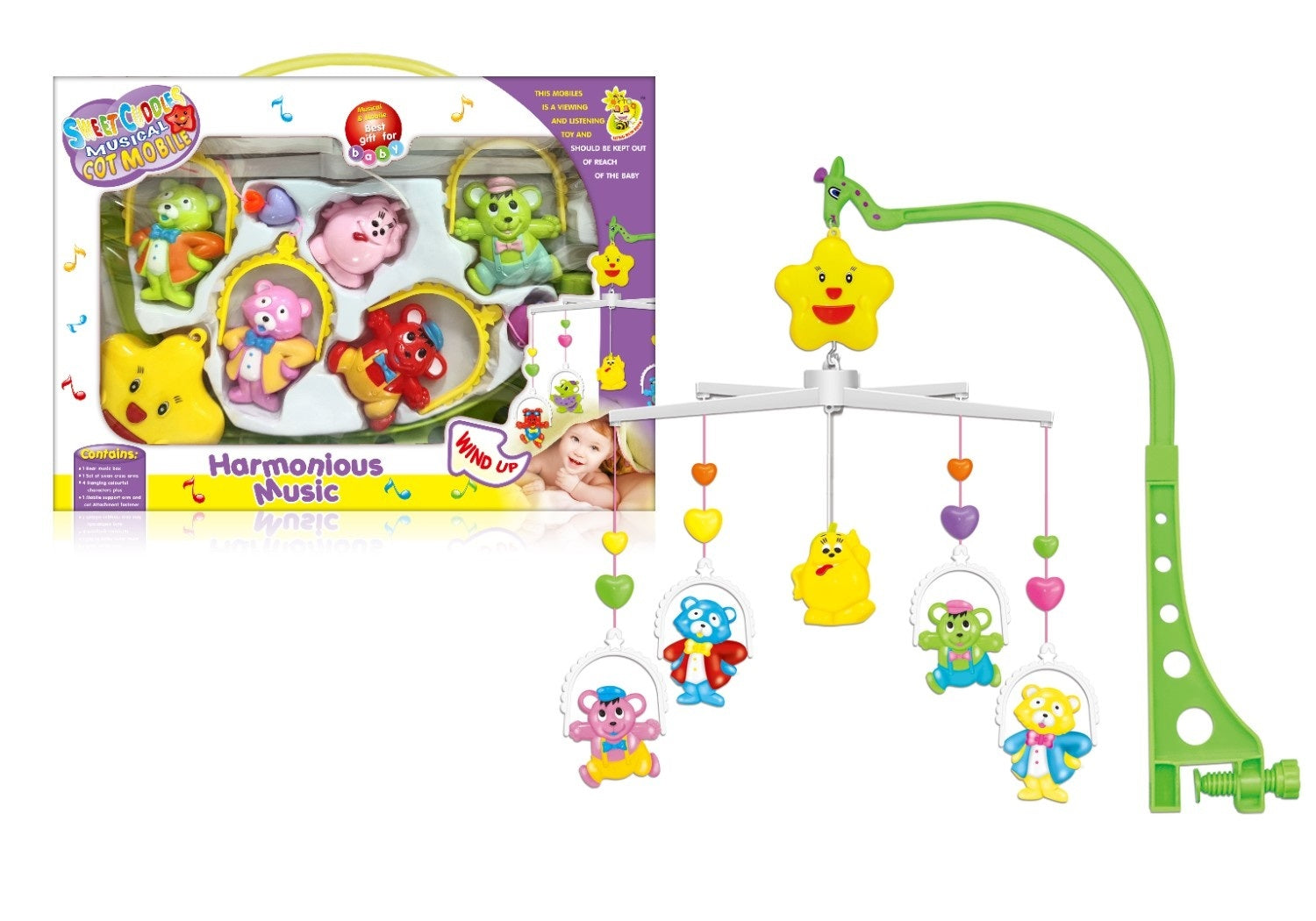 The Sweet Choice Musical Cot Mobile – Harmonious Music features a colorful cast of animal friends dressed in cute outfits, designed to engage and delight your baby. This wind-up mobile plays soothing music and includes a bright yellow star-shaped music box. The vivid green arm securely attaches to cribs, while the rotating figures stimulate visual development. Perfect for calming and entertaining your little one during naptime or play.