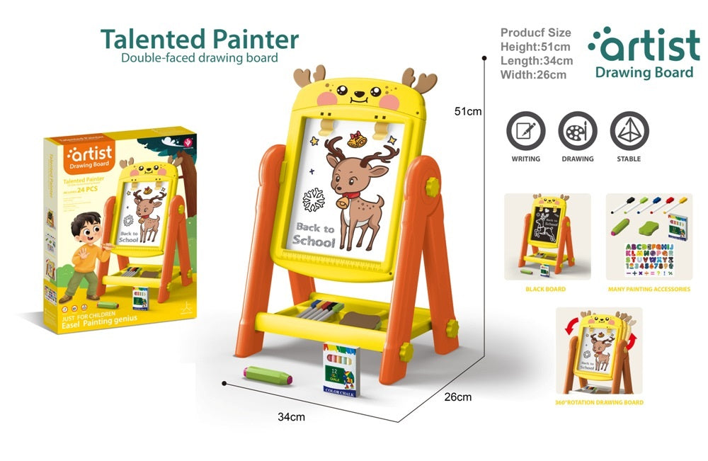 Inspire your little one’s artistic journey with the Artist Drawing Board – Talented Painter (Deer Edition). Designed for creative exploration, this double-sided easel features a delightful deer-themed design that kids will love. With both a blackboard and a whiteboard, children can draw, write, and learn in a fun, hands-on way.