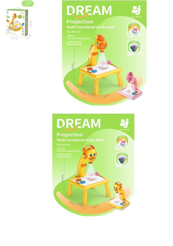 Make learning and creativity fun with the DREAM Projection Multi-Functional Study Desk! This interactive desk features a light-up projector that displays images on to the drawing surface, helping children easily trace and color. With a friendly giraffe-shaped projector head and a sturdy desk design, it’s perfect for budding artists. The set includes discs with multiple images, colorful markers, and a drawing pad. Whether practicing letters, numbers, or artwork, this desk encourages fine motor skills, creativity, and early learning development. Ideal for children aged 3 and up, it combines education and play in one fun, compact setup